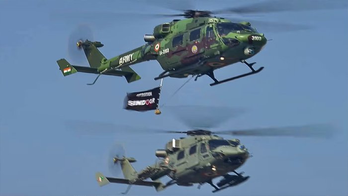 कर्तव्य पथ पर परेड की शुरुआत में कैप्टन विजय प्रताप के नेतृत्व में प्रहार फॉर्मेशन में फ्लाईपास्ट किया गया। इसमें लेफ्टिनेंट कर्नल अहमद पाशा की ओर से उड़ाए जा रहे ध्रुव एडवांस्ड लाइट हेलीकॉप्टर (ALH) पर भारतीय सेना के ऑपरेशन सिंदूर का ध्वज दिखा। इस फ्लाईपास्ट में भारतीय सेना के ALH डब्ल्यूएचआई और भारतीय वायुसेना के एएलएच मार्क-4 हेलीकॉप्टर ने भी भाग लिया।